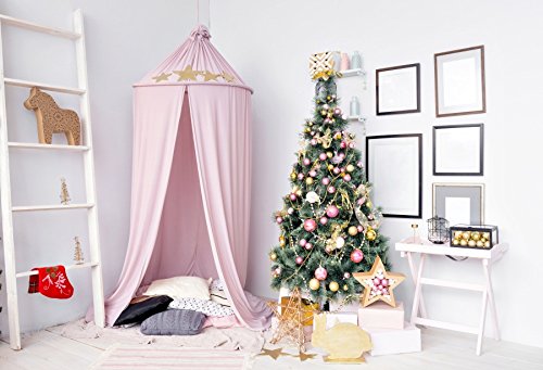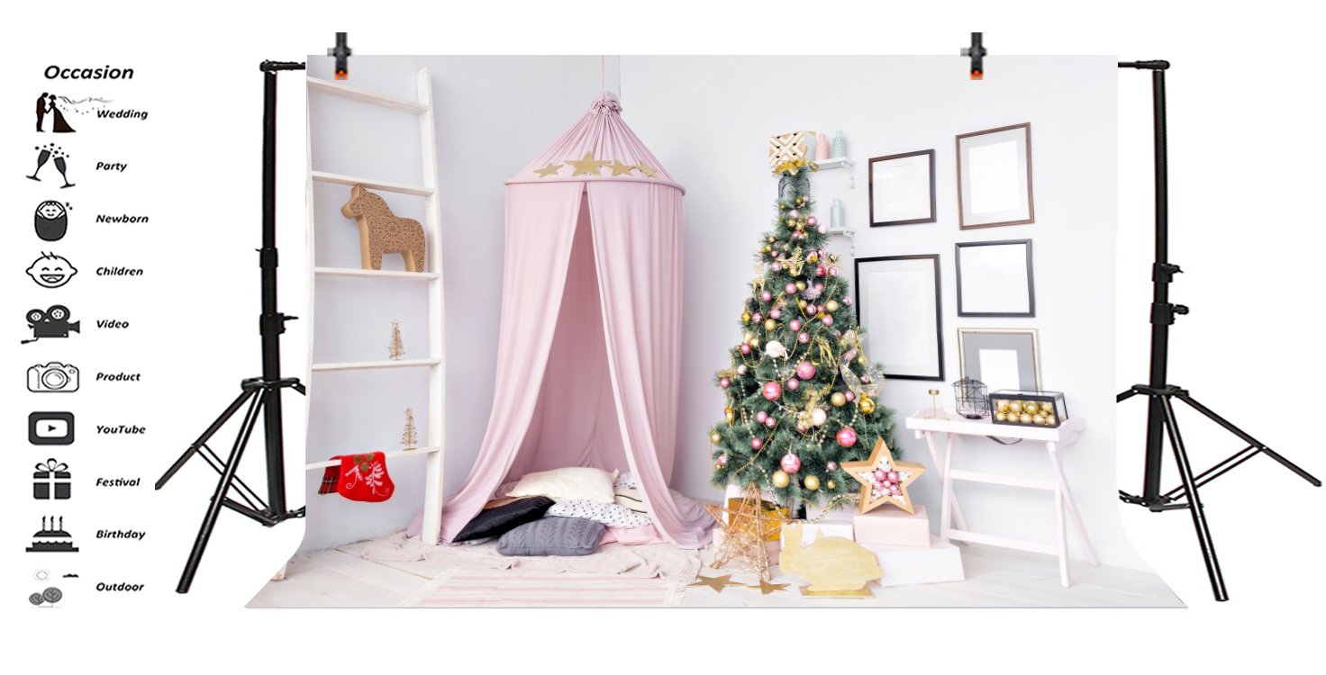 特別セーフ Baocicco B07GDVT2B9 新年冬の休暇パーティー フォトフレーム 星の装飾 バウブルボール カラー ラダー ホワイトルーム 背景 ビニール写真 10x8フィート 背景 クリスマスツリー テント ピンクカーテン 子供部屋-バックペーパー背景布