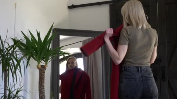 Blondes Mädchen Entscheidet Sich Für Einen Roten Mantel Für Die — Stockvideo © massonforstock #388566356